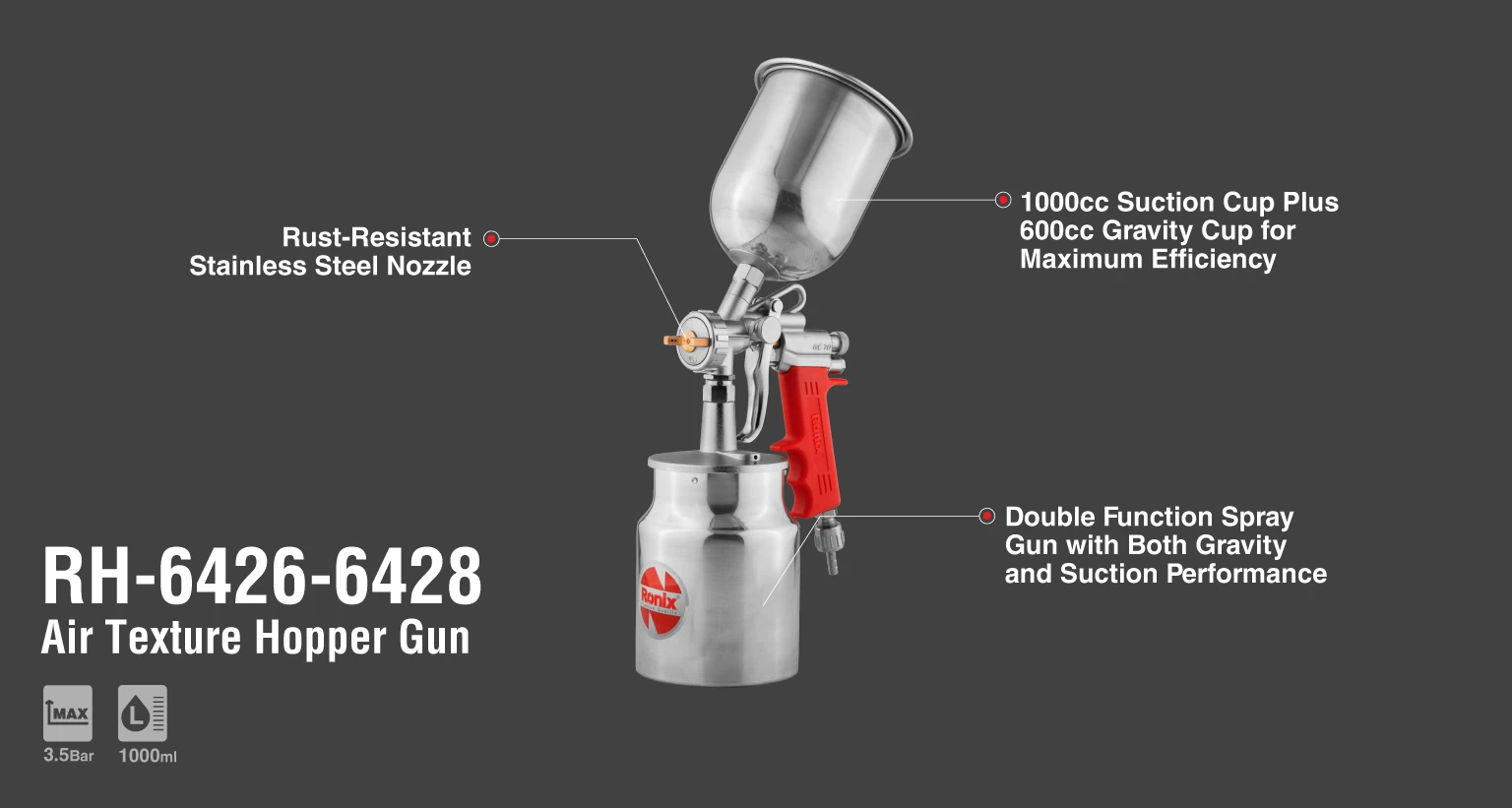 به علاوه، RH-6426-RH-6428نازل­هایی با سایز 1.6 و 1.8 دارد و از یک کاسه پایینی با ظرفیت 1000 میلی لیتر و یک کاسه بالایی با ظرفیت 600 میلی لیتر بهره می­برند تا بهترین نتیجه را برای کاربر به ارمغان بیاورند.