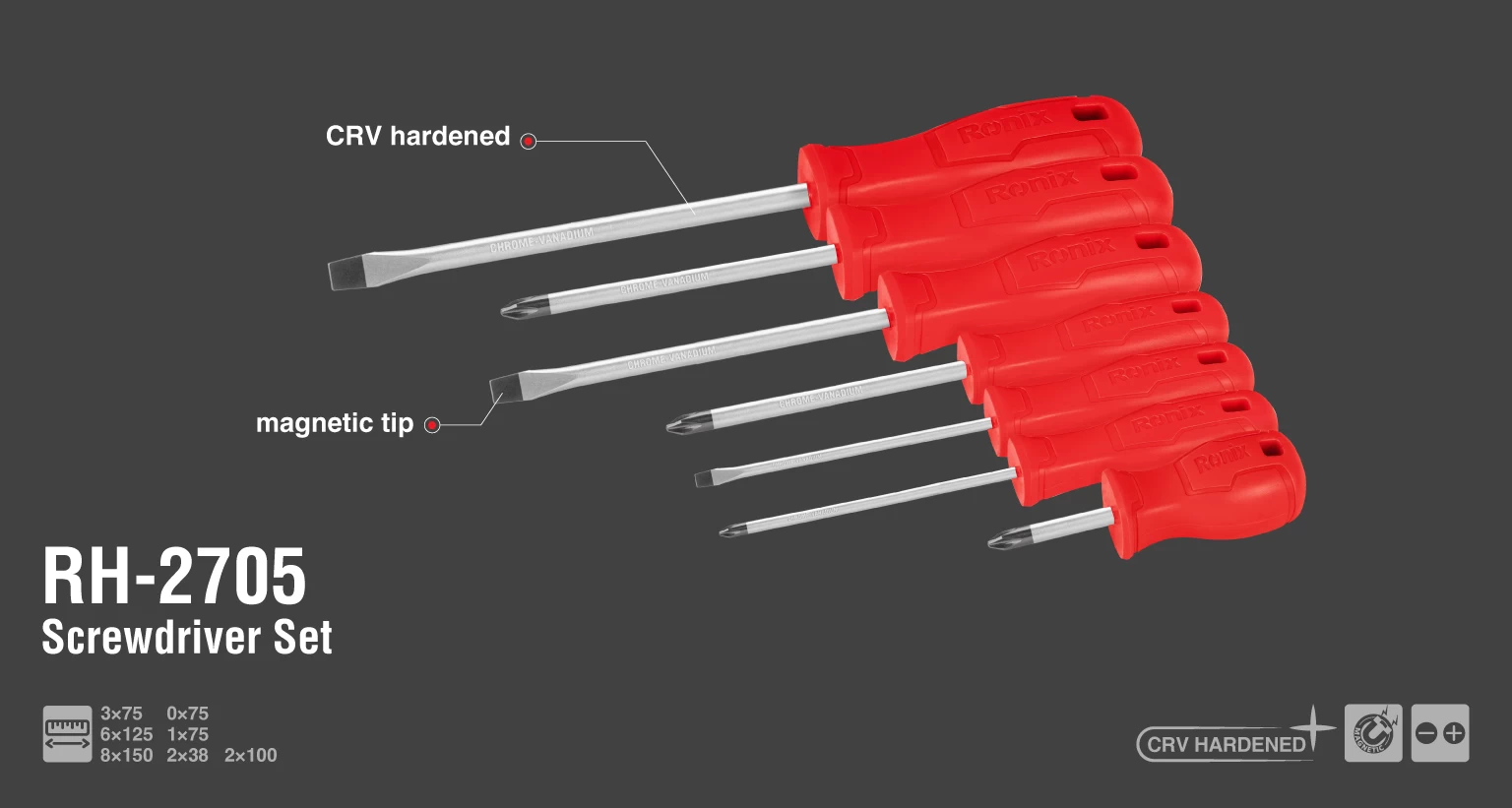 + مجموعه پیچ گوشتی 2705-RH رونیکس: تعداد، ابعاد و ویژگیها