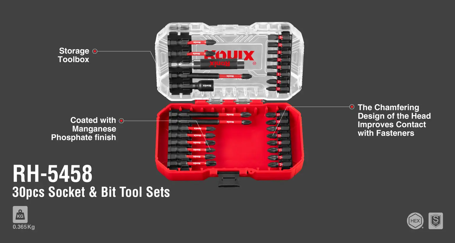 ست بیت و بکس فشار قوی 30 عددی رونیکس مدل RH-5458 در جعبۀ پلاستیکی مقاوم و قابل حمل به بازار عرضه شده است.