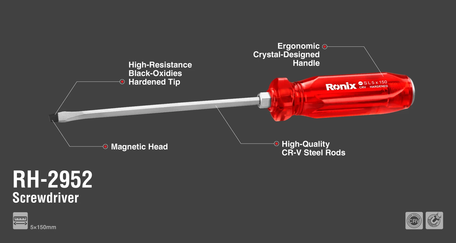در بخش شرح جزئیات محصول، با مشخصات کاربردی پیچ گوشتی ضربهخور تکی 150×5 میلیمتری دوسو رونیکس مدل RH-2952 آشنا شوید.