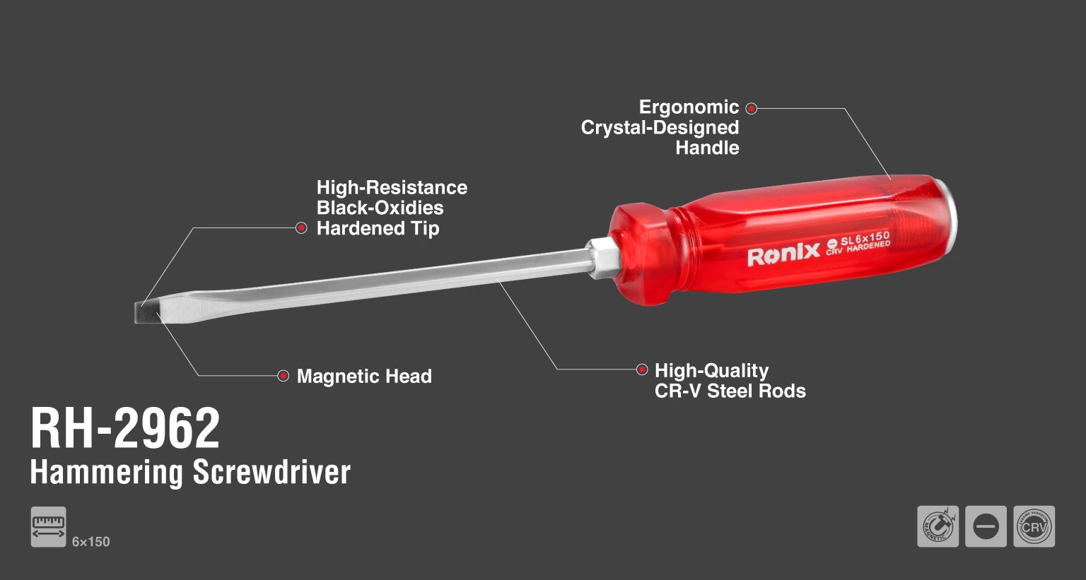 پیچ گوشتی ضربه خور دو سوی رونیکس مدل RH-2962 از پیچ گوشتی های پر کاربرد و با کیفیت بالا است. این محصول مجهز به میله ای با سایز SL6 یا 6 میلیمتر و به طول 150 میلیمتر است. این میله از کروم وانادیوم (CR-V) ساخته و سپس سختکاری شده و حرارت دیده است و با آلیاژ کروم روکش شده تا در برابر فشار، خوردگی و سایش و پیچش مقاومت بیشتری داشته باشد و در هنگام کار دچار خمیدگی و شکستگی نشود.