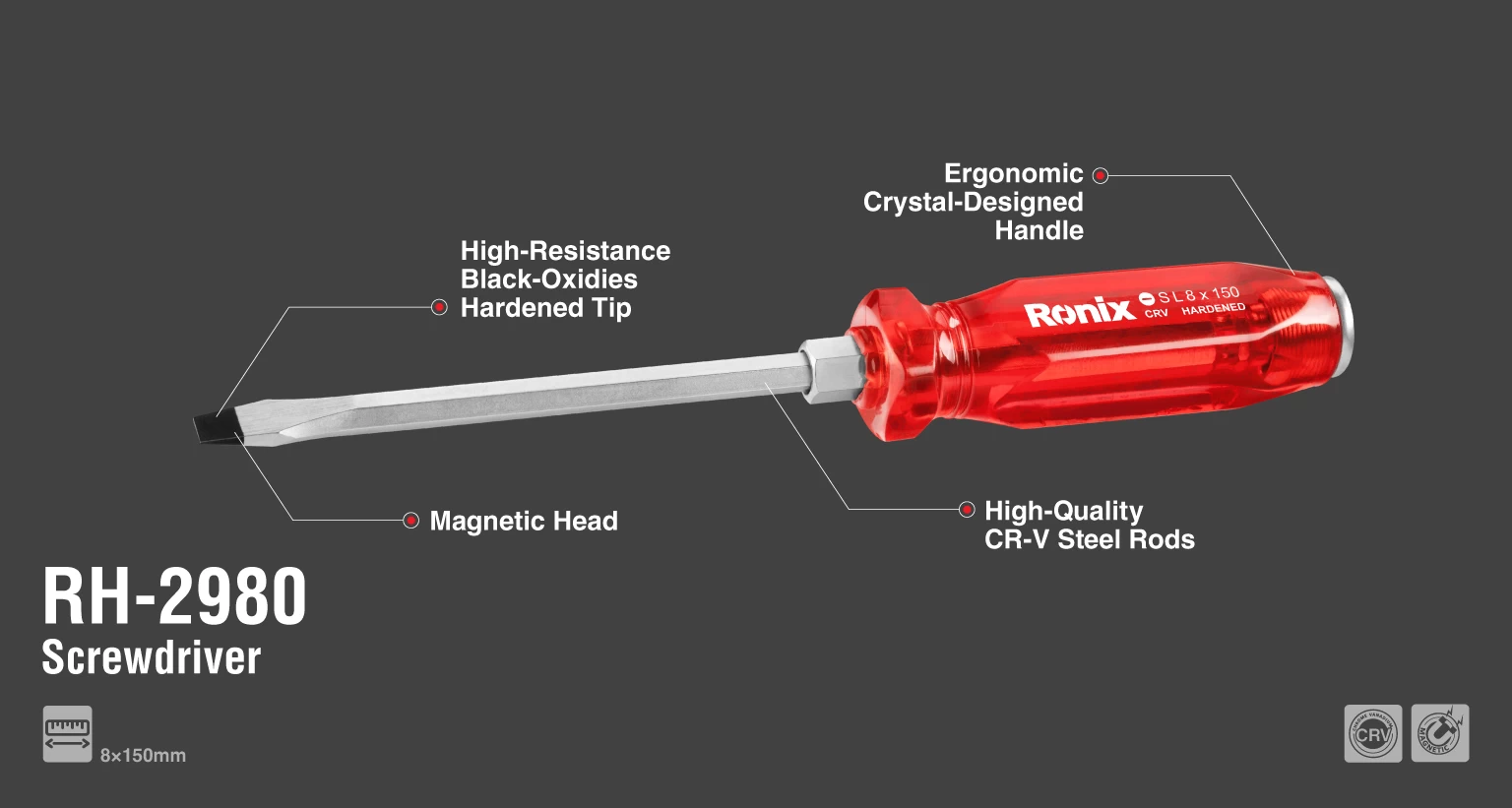 رونیکس به عنوان متنوعترین برند بازار ابزار ایران، انواع پیچ گوشتی را با توجه به نیاز شما و با کیفیت بینظیر تولید میکند. پیچ گوشتی تکی ضربهخور رونیکس مدل RH-2980، تنها یکی از نمونههای این مجموعه متنوع است.