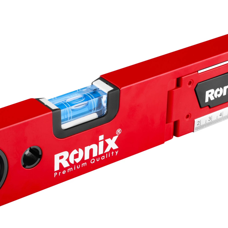 تراز بنایی تاشو رونیکس دارای دو مقیاس اندازهگیری 90 و 180 درجه است و در هر متر 0,5 میلیمتر خطا دارد.