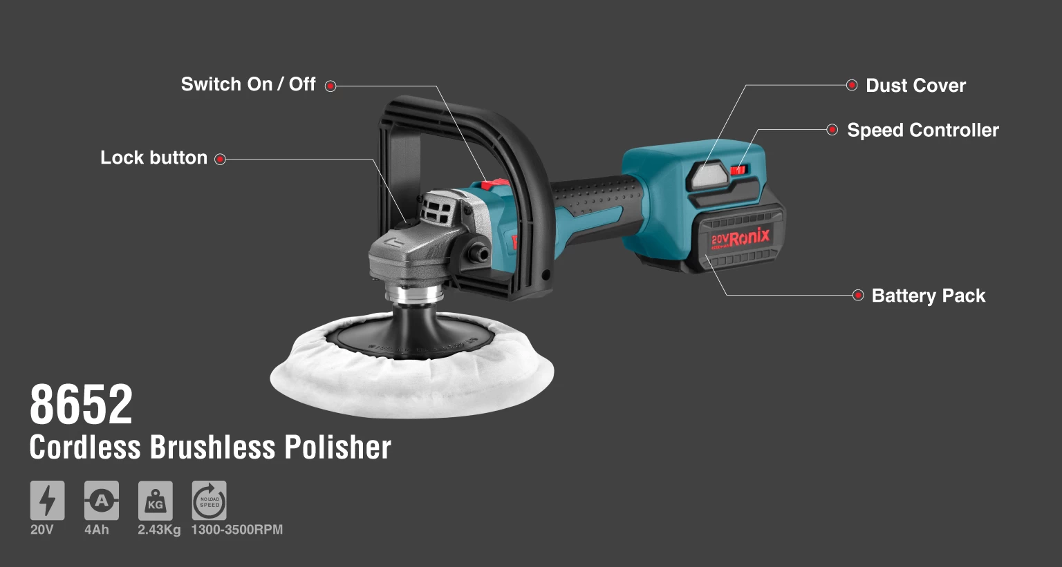 در بخش توضیحات محصول، با مشخصات پولیش شارژی 20 ولت براشلس رونیکس مدل 8652 آشنا شوید.