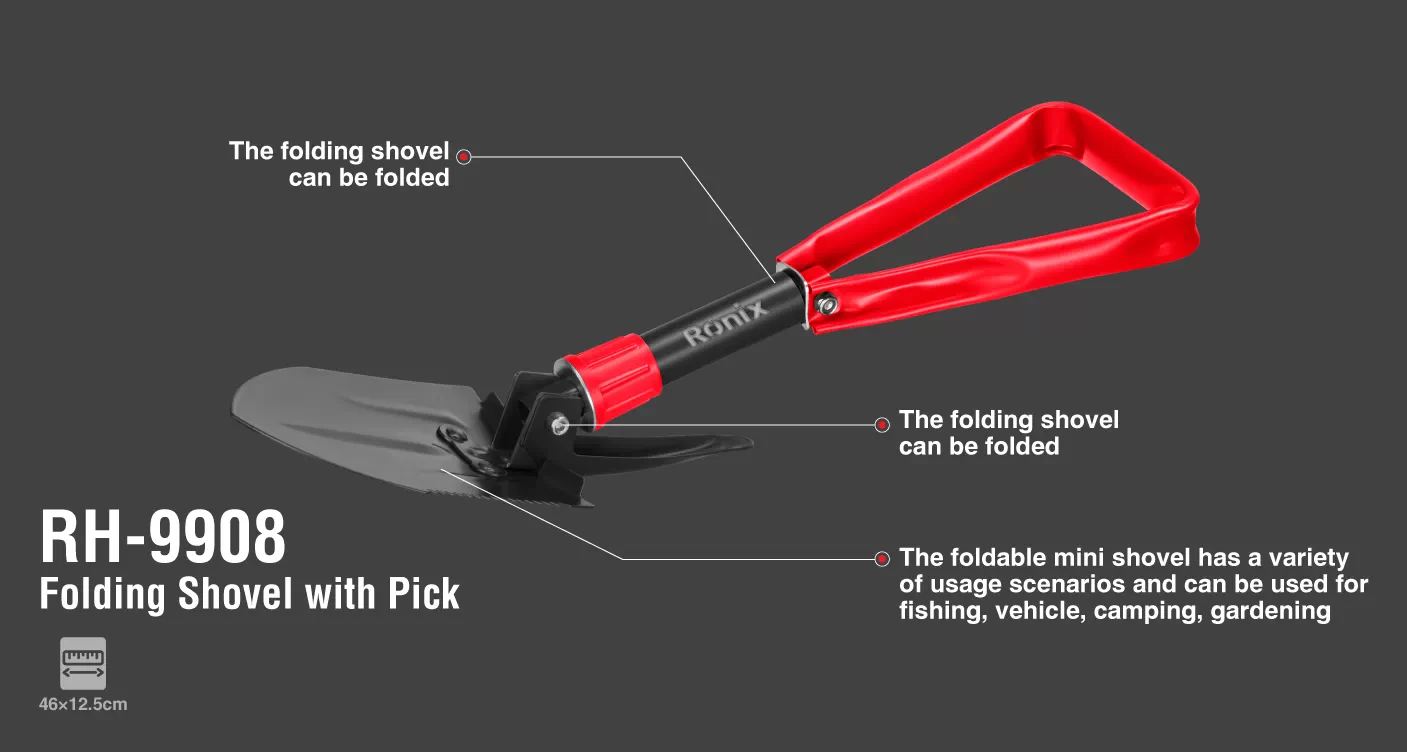 بیلچه چندکاره کمپینگ رونیکس مدل RH-9908 یک ابزار کاربردی برای بیلزدن، بریدن شاخهها، ارهکردن چوب، حفر زمین و حتی کندن سنگ است. این ابزار چندمنظوره گزینهای ایدهآل برای کمپینگ، ماهیگیری، خودرو، باغبانی و کشاورزی تبدیل کرده است. این ابزار دارای سه عملکرد بیلچه، تبر و کلنگ است.