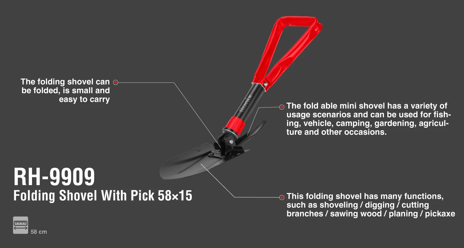 این بیلچه تاشو دارای عملکردهای زیادی است، مانند کندن، حفاری، برش شاخهها، اره کردن چوب، کندهکاری، بیلچه و غیره.
