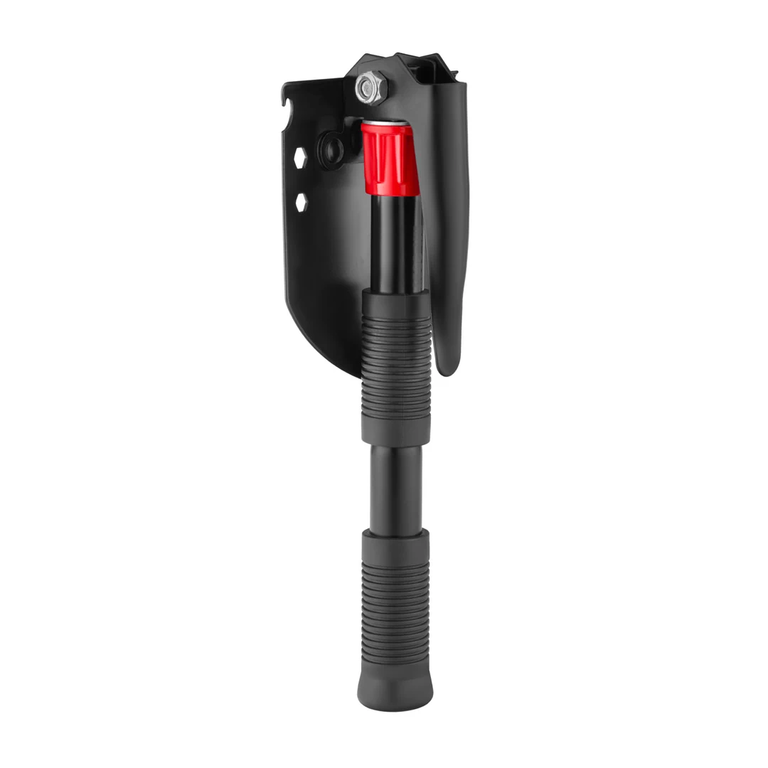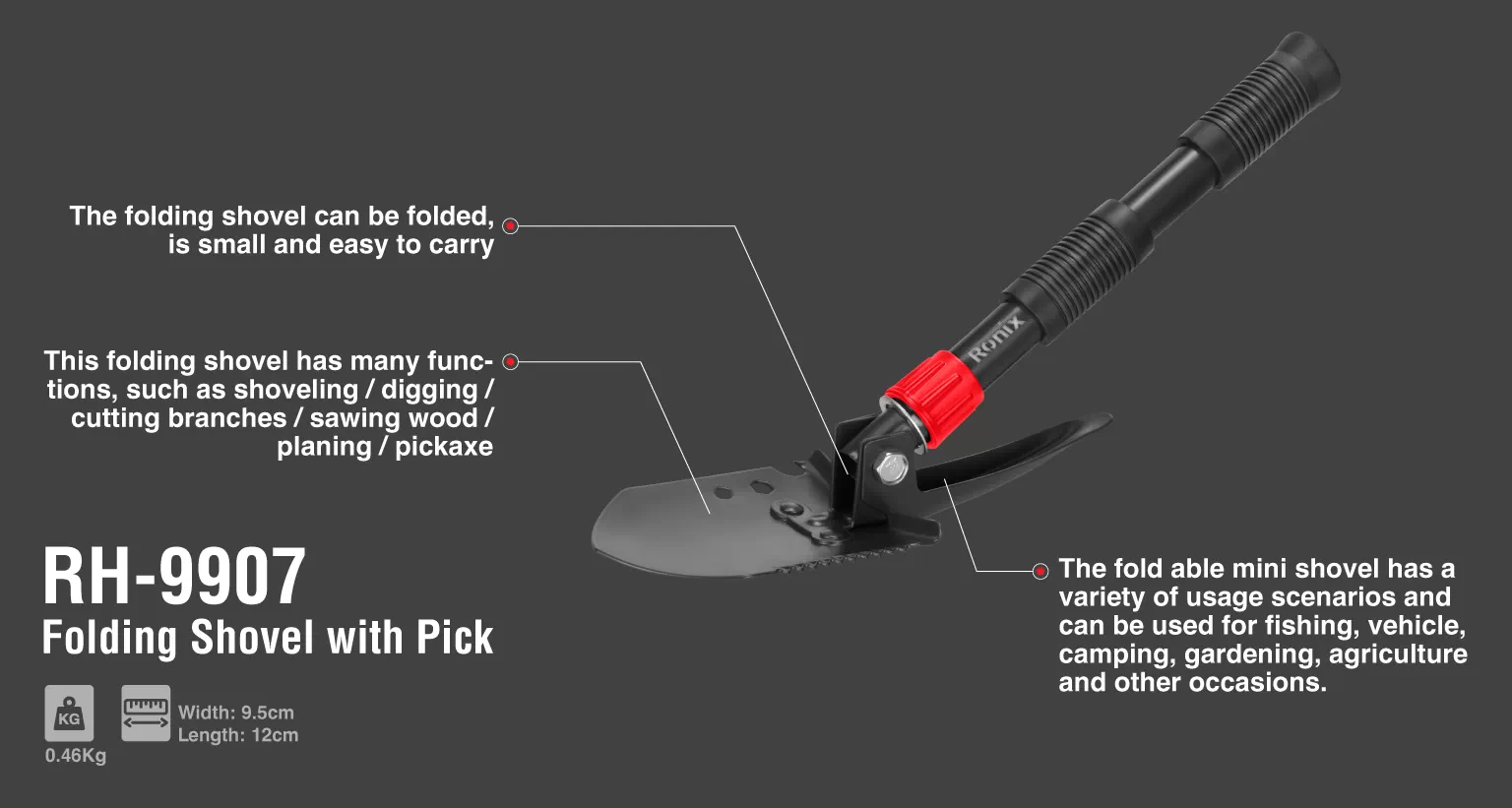 This folding shovel supports many functions: shoveling, digging, cutting branches, sawing wood, planing, pickaxe, and more.
