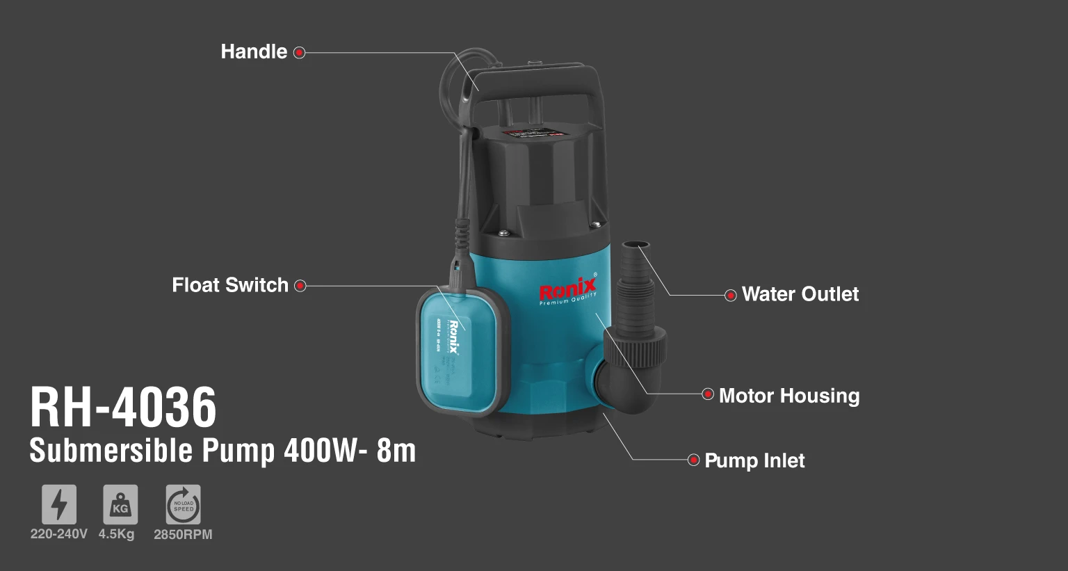 پمپ کفکش پلاستیکی 8 متری رونیکس مدل RH-4036 با توان 400 وات، ابزاری کاربردی برای انتقال و تخلیه آب تمیز و سیالات غیر چسبناک است. این پمپ به صورتی طراحی شده است که بهطور کامل در آب غوطهور شود و آب را بالا کشیده و تخلیه کند. این پمپ برای مصارف خانگی، تخلیه آب استخرها، مخازن و حتی آبیاری باغها و محوطهها ایدهآل است.