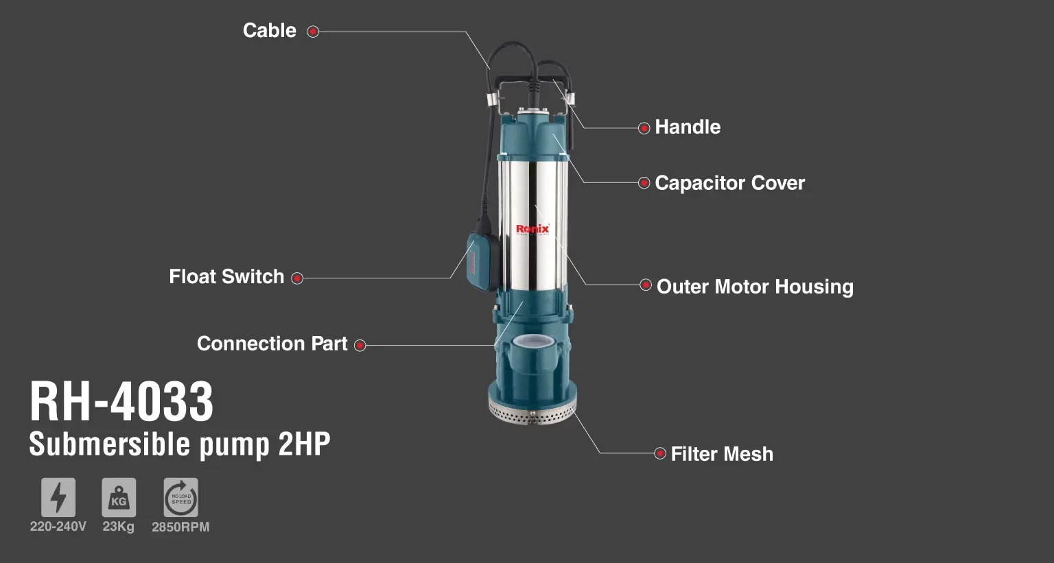 پمپ کفکش RH-4033 با طراحی غوطهور، مناسب برای انتقال آب تمیز از مخازن، استخرها و منابع کمعمق است. پوسته چدنی مقاوم و سیل مکانیکی سرامیک/گرافیت با فیسهای آببندی سیلیکون کاربید باعث افزایش بهرهوری و دوام بالا در عملکرد آن شدهاند. همچنین، شفت از جنس فولاد ضد زنگ 316+45 و سیمپیچ تماممسی نقش مهمی در افزایش مقاومت در برابر خوردگی و بهبود عملکرد پمپ دارند. این پمپ قادر به پمپاژ آب تا ارتفاع 48 متر و عبور ذرات معلق تا قطر 4 میلیمتر است. قطر خروجی 2 اینچی دهانه نیز امکان تخلیه سریع و کارآمد سیال را فراهم میکند. این پمپ، دبی خروجی بین 2 تا 9,2 متر مکعب بر ساعت را ایجاد میکند.