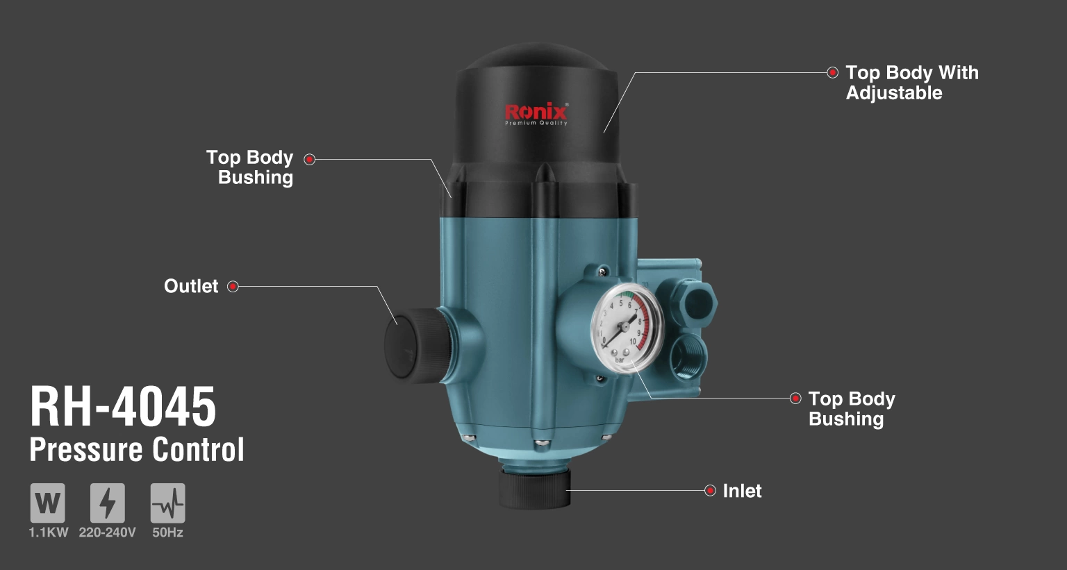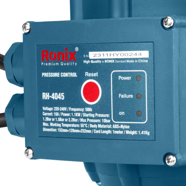 ست کنترل پمپ آب رونیکس مدل RH-4045 در جعبه رنگی رونیکس به بازار ابزار ایران عرضه میشود.