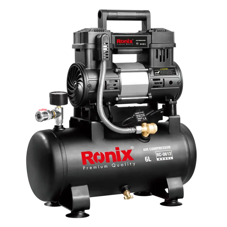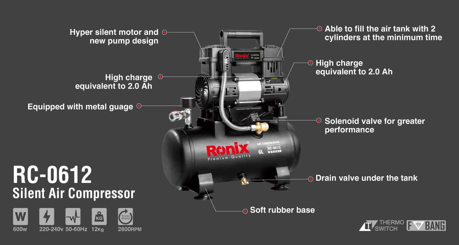 طراحی هوشمندانه و کمحجم بدنه، موتور القایی اویل فری، قابلیت حمل آسان، ایجاد سر و صدای کم در حین کار و مجهزبودن به گیج فشار فلزی، از ویژگیهای مهم کمپرسور باد سایلنت ۶ لیتری 600 وات RC-0612 رونیکس هستند.