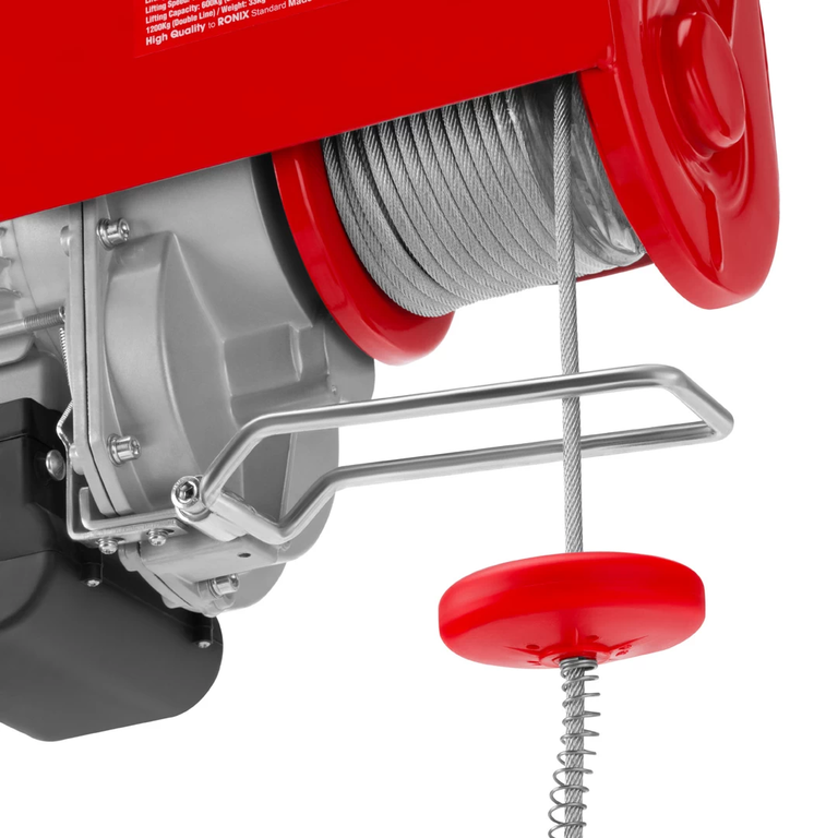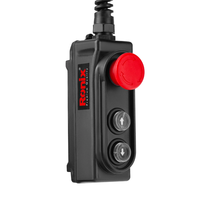 این بالابر به کنترل از راه دور با کلید دستهای نصبشده بر روی بدنه مجهز است که امکان کار ایمن از فاصله مناسب را فراهم میکند. وجود سوئیچ محدودکننده (Limit Switch) و فنر ضربهگیر (Buffer Spring) نیز باعث میشود دستگاه بهطور خودکار متوقف شده و از سقوط ناگهانی بار جلوگیری شود.