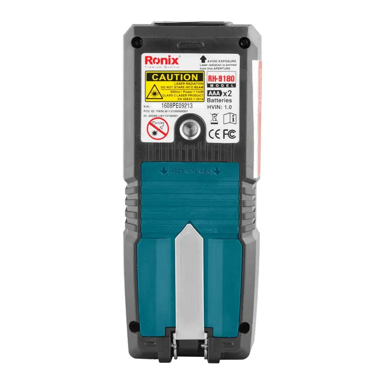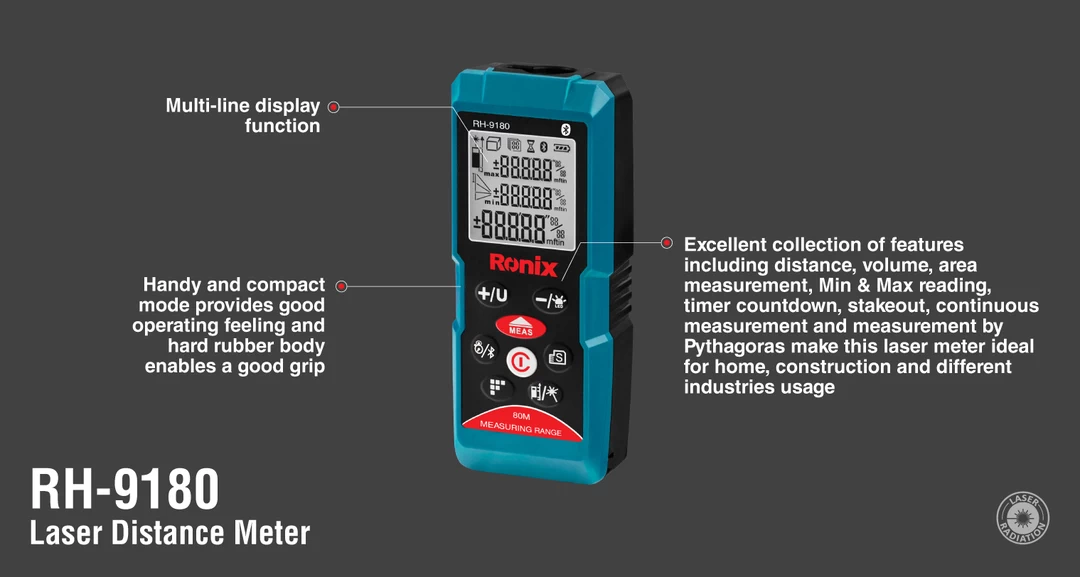 مهمترین مشخصه این متر لیزری، امکان استفاده از فناوری لیزر با دقت فوقالعاده بالای اندازهگیری است. نوع لیزر مورد استفاده در متر لیزری RH-9180 رونیکس، کلاس 2 با طول موج 635 نانومتر و برای انسان بیخطر است.