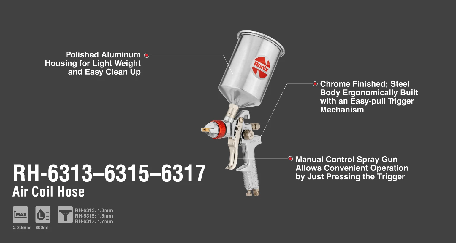 طراحی پپیشرفته و ارگونومیک مجموعه پیستوله های بادی رونیکس این امکان را برای کاربر فراهم کرده که با بهره بردن از نیروی جاذبه پاششی یکنواخت و یکپارچه را روی سطح مدنظر خود داشته باشد. این پیستولهها از قابلیت کنترل دستی برخوردارند که به تسهیل انجام فرایند کار برای کاربر منجر میشود.