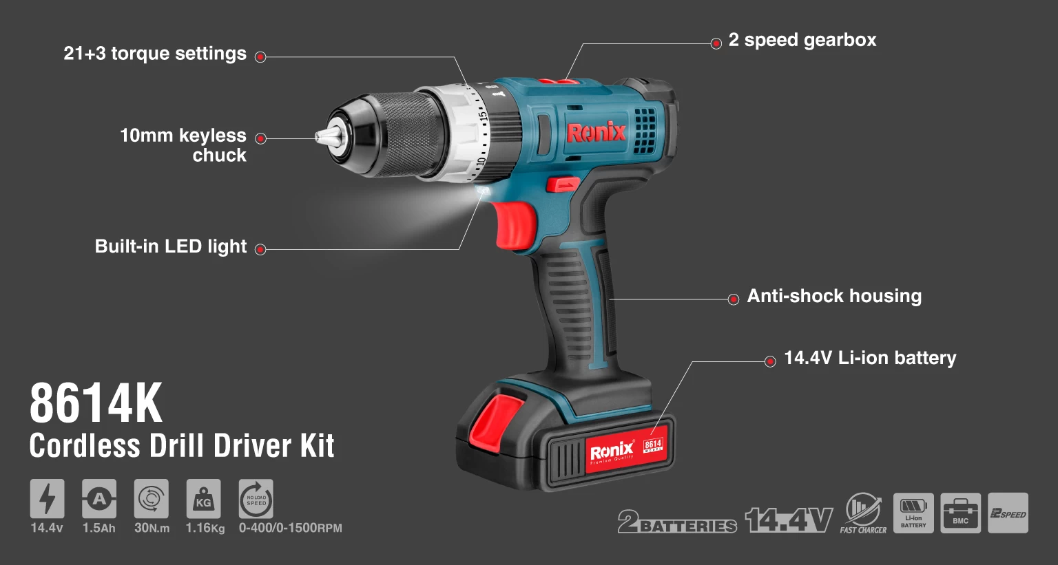 کیت دریل پیچ گوشتی شارژی 8614K رونیکس، مجهز به یک موتور قدرتمند و کلاچ 21 حالته است که دقت فرآیند کار را بالا میبرد. این دریل شارژی رونیکس با طراحی زیبا و ارگونومیک، موجب عدم خستگی دست کاربر در حین انجام کار شده و در انجام تعمیرات، ساخت وسایل مختلف و نیز انجام پروژههای DIY به او کمک میکند.