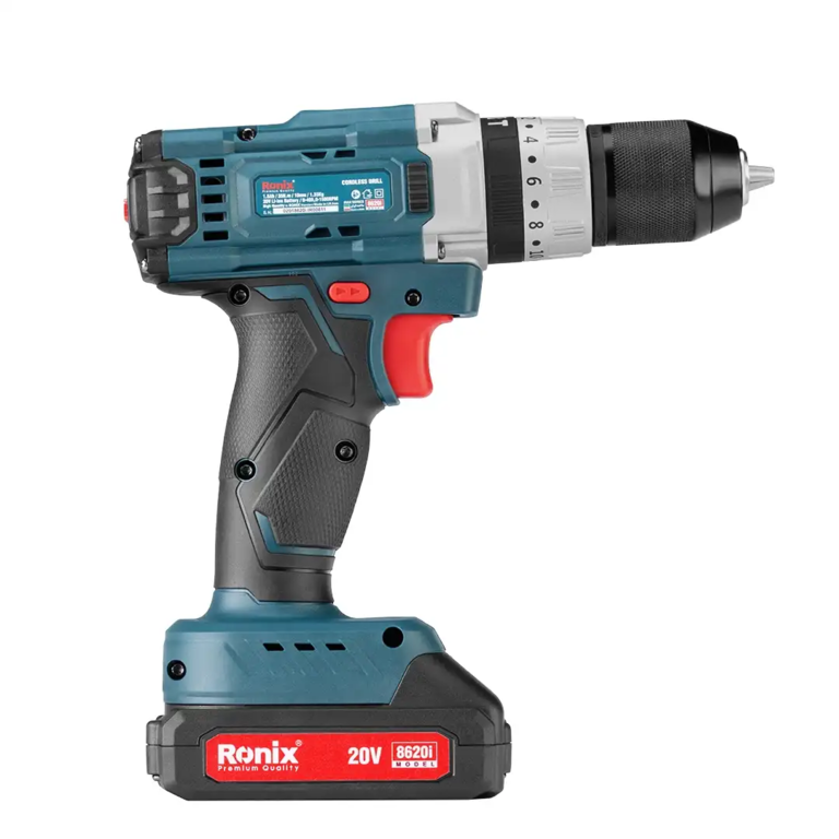 دریل پیچ گوشتی چکشی شارژی 8620i رونیکس ساخت ایران در کیف BMC مقاوم همراه با یک جفت باتری لیتیومیونی 20 ولت با ظرفیت 1,5 آمپرساعت و یک شارژر سریع به بازار ابزار ایران عرضه میشود.