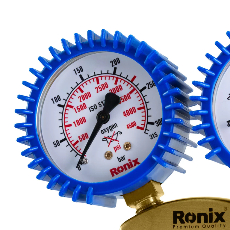 این مانومتر رونیکس مجهز به دو گیج برای نمایش فشار ورودی و خروجی است؛ گیج ورودی محدوده 0 تا 315 بار و گیج خروجی محدوده 0 تا 16 بار را اندازهگیری میکند.