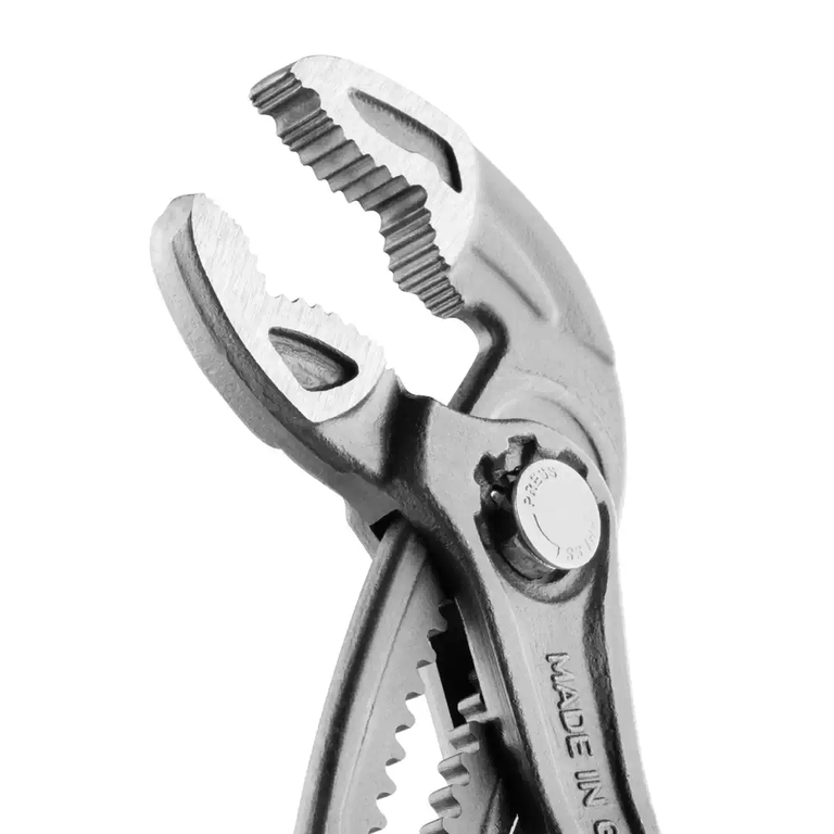 وجود دو ردیف دندانه در فکهای سختکاریشده در زوایای مختلف موجب افزایش سطح تماس و قدرت گیرایی بیشتر این ابزار میشود. فکها را میتوان به راحتی با فشاردادن و رهاکردن دکمه روی ابزار تنظیم کرده و عملکردی سریع، بیوقفه و روان را تضمین کرد. مکانیزم تنظیم قوسی دقیق CurveGripp با دندانههای ریز، امکان تطبیق سریع و ایمن فکها با قطعه کار را فراهم میکند. این سیستم باعث افزایش دقت و ثبات هنگام استفاده میشود. همچنین، میتوانید از فکهای پلاستیکی برای کارهای حساس و بدون آسیب به قطعه کار استفاده کنید. طراحی فک با هندسه بهینه و دندانههای خودقفلشونده موجب نگهداشتن ایمن قطعه بدون نیاز به اعمال فشار مداوم میشود. این انبر کلاغی ساخت آلمان، با بهرهگیری از طراحی فک با شیارهای قوسی و گامدار، امکان تنظیم زاویهای دقیق را فراهم میسازد. این طراحی به کاهش لقی و بهبود دقت حرکت فکها در هنگام استفاده کمک میکند. سختی دندانههای این انبر کلاغی برابر با 55-57HRC است.