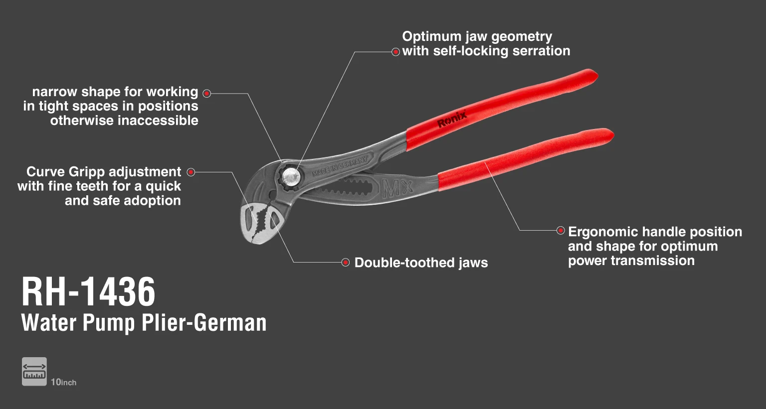 انبر کلاغی 10 اینچ آلمانی رونیکس مدل RH-1436، در بستهبندی رونیکس به بازار ابزار ایران عرضه میشود.