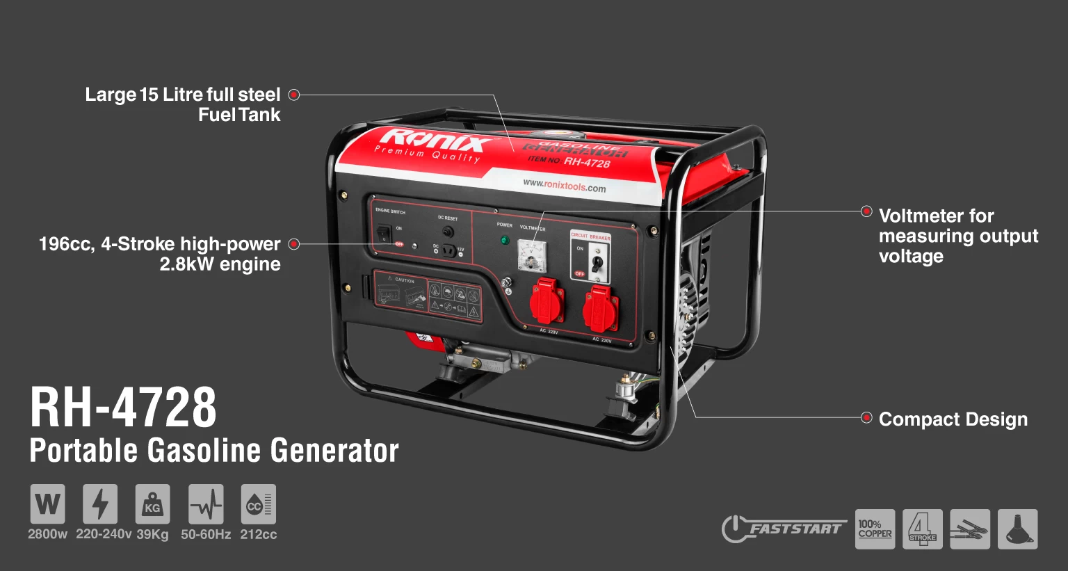 ژنراتور RH-4728 رونیکس، با نویز کمتر از 68 دسیبل کار میکند. همچنین، دارای 2 خروجی برق متناوب 220 ولت، یک خروجی 8 آمپر 12 ولت مستقیم و یک ولتمتر آنالوگ برای نمایش میزان اختلاف پتانسیل خروجی دستگاه نیز میباشد.