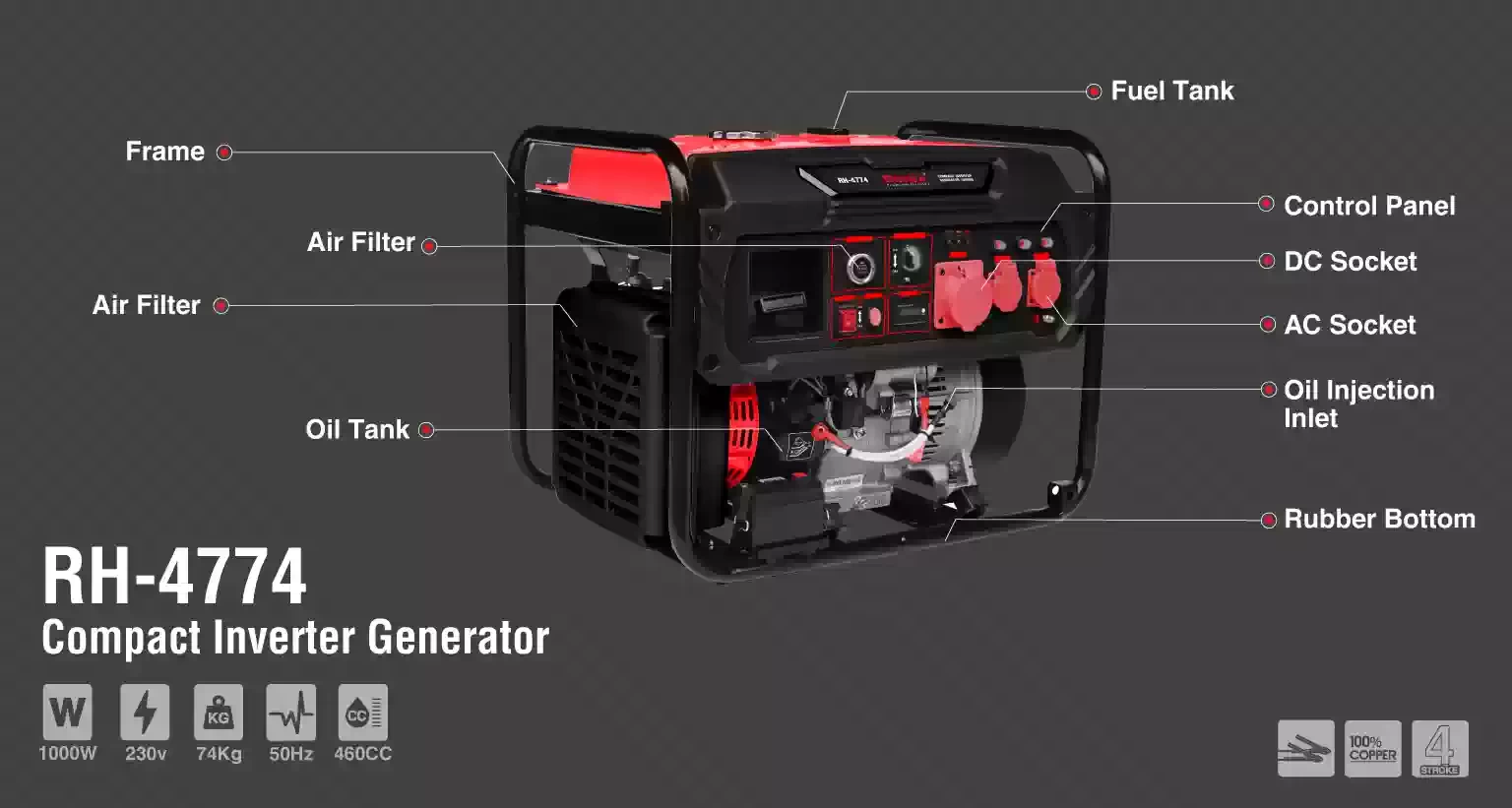ژنراتورِ موتور برق کامپکت رونیکس مدل RH-4774 از نوع اینورتر ژنراتور است که یک خروجی DC (12 ولت و 8,3 آمپری) دارد. حداکثر توان خروجی این ژنراتور 10000 وات و نرخ توان خروجی آن 9000 وات است.